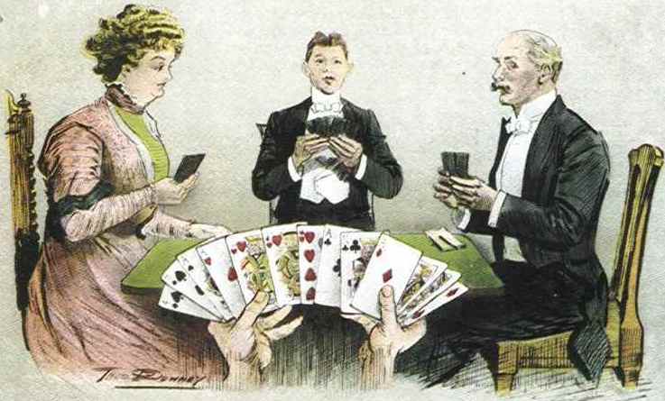 Il n’y a pas à mon avis de tableau d’un peintre célèbre représentant une partie de bridge, mais la partie de bésigue de Gustave Caillebotte est, non seulement un très beau tableau mais illustre assez bien ce qu’est une partie de bridge.