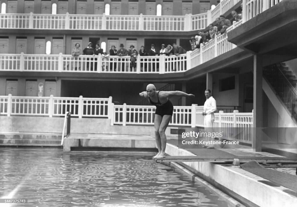 En présence de deux champions de natation : le quintuple médaillé olympique Johnny Weissmuller, futur interprète de Tarzan pour la Metro-Goldwyn-Mayer et l’Américaine Aileen Riggin Soule
