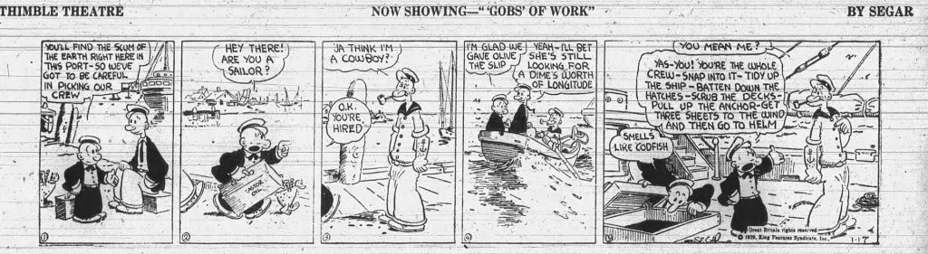 Est un comic strip créé par E. C. Segar sous le nom The Thimble Theatre (« Le Théâtre de poche ») et distribué à partir du 19 décembre 1919 par King Features. À l’origine parodie des serials mélodramatiques et du théâtre de boulevard, The Thimble Theatre évolue rapidement vers l’aventure humoristique. C’est avec l’apparition du marin borgne Popeye en 1929 qu’elle commence à connaître le succès.