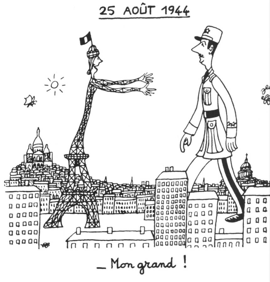 Merveilleuse caricature de Jean Effel qui résume en un dessin Charles De Gaulle. A la fin de la guerre, la caricature du Général lors de la Libération s’installe comme élément fondamental de l’expression des antigaullismes: mégalomanie, grande taille, long nez et habillement militaire.