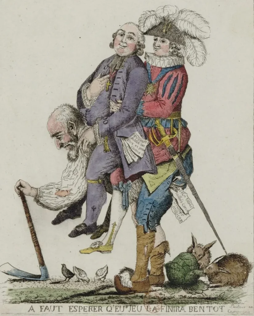 Caricature révolutionnaire ayant pour titre : « À faut espérer q’eu jeu la finira ben tôt » – Représentation de l’Ancien Régime par 3 figures faisant référence aux trois états de la société d’ordre, 1789