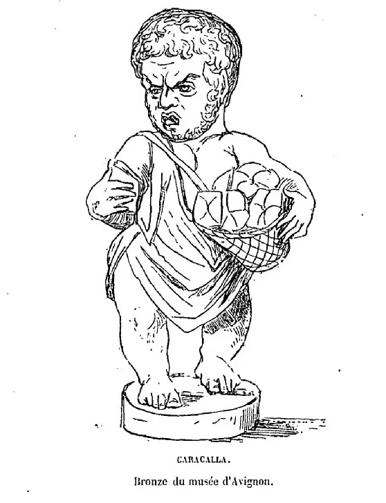 Statuette en bronze représentant sous la forme d’une caricature l’empereur Caracalla toujours présente au Musée Lapidaire d’Avignon (Histoire de la caricature antique, par Champfleury)