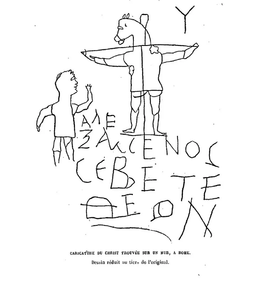 Caricature antique représentant le Christ avec une tête d’âne durant les premiers temps du christianisme (Histoire de la caricature antique de Champfleury)
