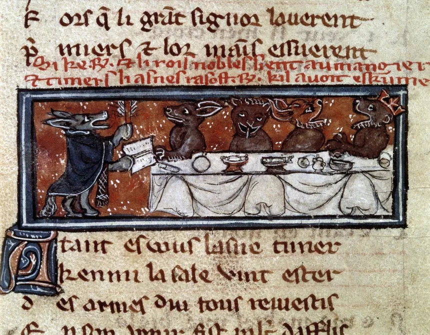 Miniature tirée du manuscrit « Le Roman de Renart ». Allégorie sur la société du Moyen-âge : « À la table du roi noble ». Une scène de banquet avec un roi et ses courtisans, XIIIe-XIVe siècles