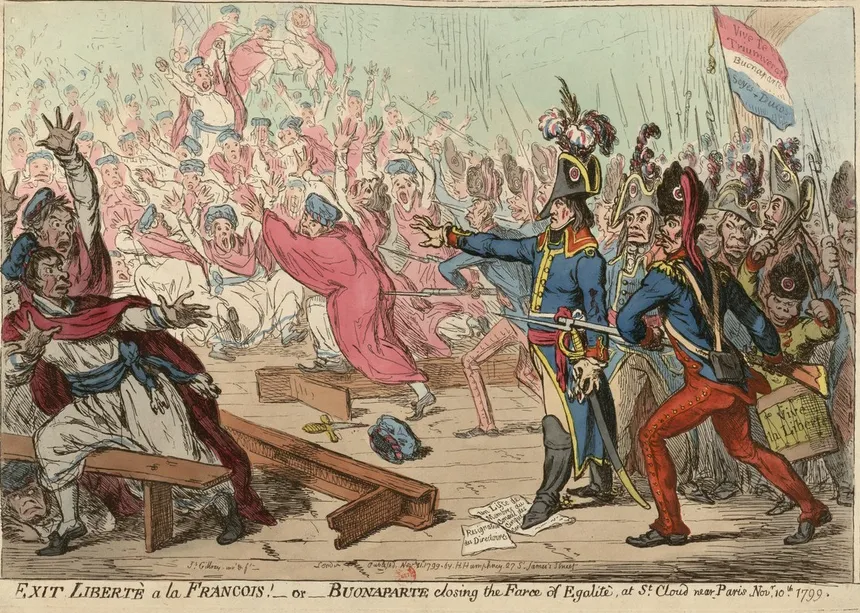 Caricature représentant Napoléon Bonaparte réalisant son coup d’État le 18 brumaire an VIII (9 novembre 1799) lors de la réunion des deux conseils parlementaires, par James Gillray – Bibliothèque nationale de France