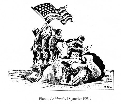 18 janvier 1991 dans le Monde Plantu s’inspire de la célèbre photo: «Lever le drapeau sur Iwo Jima» pour stigmatiser la demande faite par George Bush au Congrès américain le 3 janvier pour attaquer l’Irak.