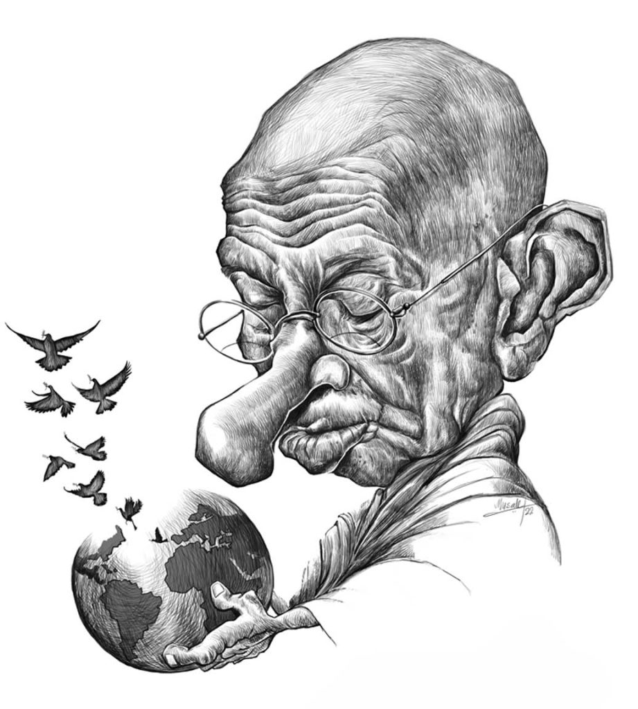 Mohandas Karamchand Gandhi, né à Porbandar le 2 octobre 1869 et mort assassiné à New Delhi le 30 janvier 1948, est un avocat indien, un nationaliste, anti-colonialiste et une personnalité politique connue pour avoir employé la résistance non violente. Caricature de l’indien Vijayakumar B. Musale