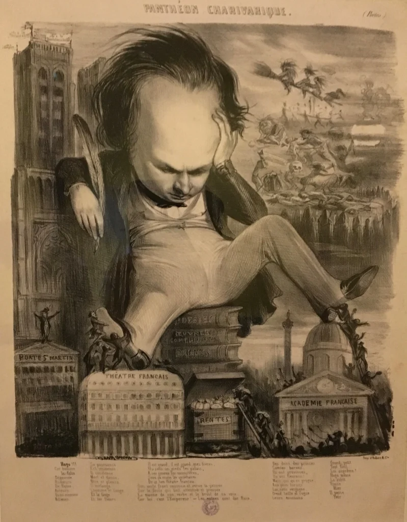Caricature de Victor Hugo paru dans Le Charivari du 24/12/1841. Adossé aux tours de Notre-Dame, assis sur ses œuvres, il soutient son front immense. Ses admirateurs lui mettent un pied à l’Académie (Panthéon) et l’autre sur le Théâtre Français. En bas, au centre, sur une échelle, des petits personnages entassent dans un coffre des sacs d’or..