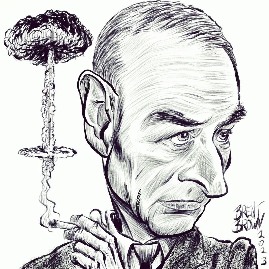 Pourquoi une deuxième caricature pour la bombe atomique? Parce que ce n’était pas la même. La première est facile à réaliser quand on possède de l’uranium enrichit à plus de 90%, l’autre au plutonium a nécessité tout le talent de Robert Oppenheimer pour y arriver.