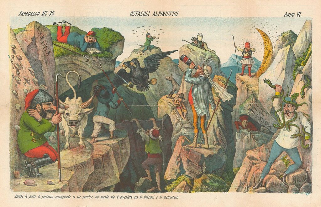 Le traité de Berlin du 13 juillet 1878 est un compromis diplomatique entre grandes puissances, qui a cherché à préserver la paix en Europe… mais au prix de l’autodétermination des peuples balkaniques. Il a contenu les ambitions russes, mais semé les graines des futurs conflits. Il a donné la Tunisie à la France. (Caricature d’Augusto Grossi)