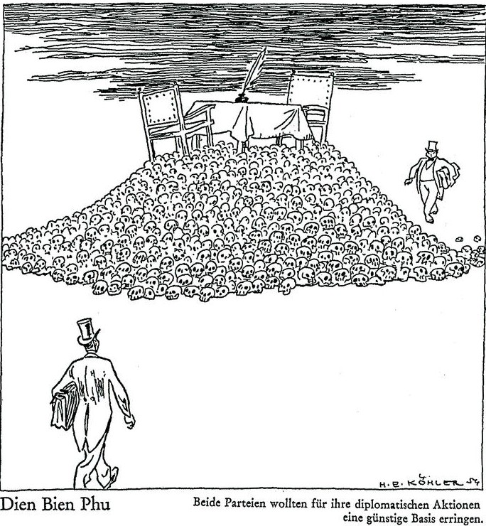 « Diên Biên Phu: Les deux parties veulent assoir leurs futures actions diplomatiques sur une base solide » En 1954, le caricaturiste allemand Köhler dresse un portrait cynique des négociations devant mettre fin aux hostilités en Indochine, (signature 21 juillet 1954 à Genève)