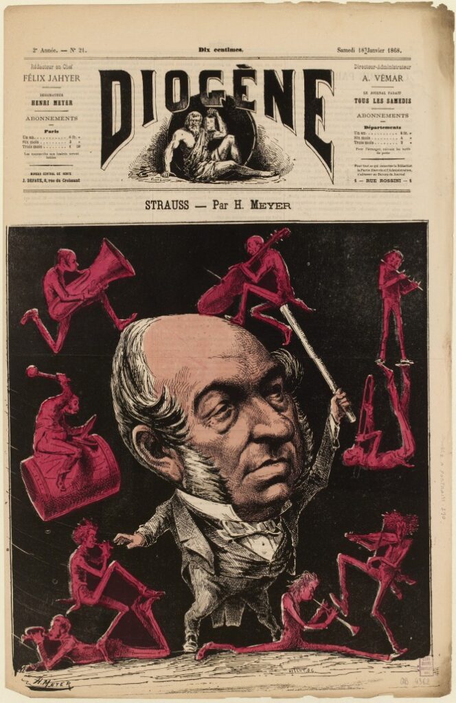 18 janvier 1868 à l’occasion de la sortie des « Légendes de la forêt viennoise » qui est une célèbre valse composée par Johann Strauss, Diogène publie cette superbe caricature dessinée par Henri Meyer, celui qui immortalisa la dégradation de Dreyfus.