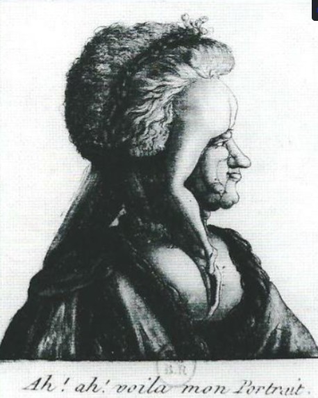 Caricature de la coiffure que portait Marie-Antoinette le 11 juin 1775 pour le couron-nement de Louis XVI. Il s’agit d’une coiffure appelé « Pouf » dont la mode fut lancé par la princesse en 1774 et qui a été crée par le coiffeur Léonard. La véritable coiffure pouvait dépasser un mètre de haut. Elle était faite de fil de fer, de tissus, de gaze, de crain et de cheveux elle pesait 6 kg.