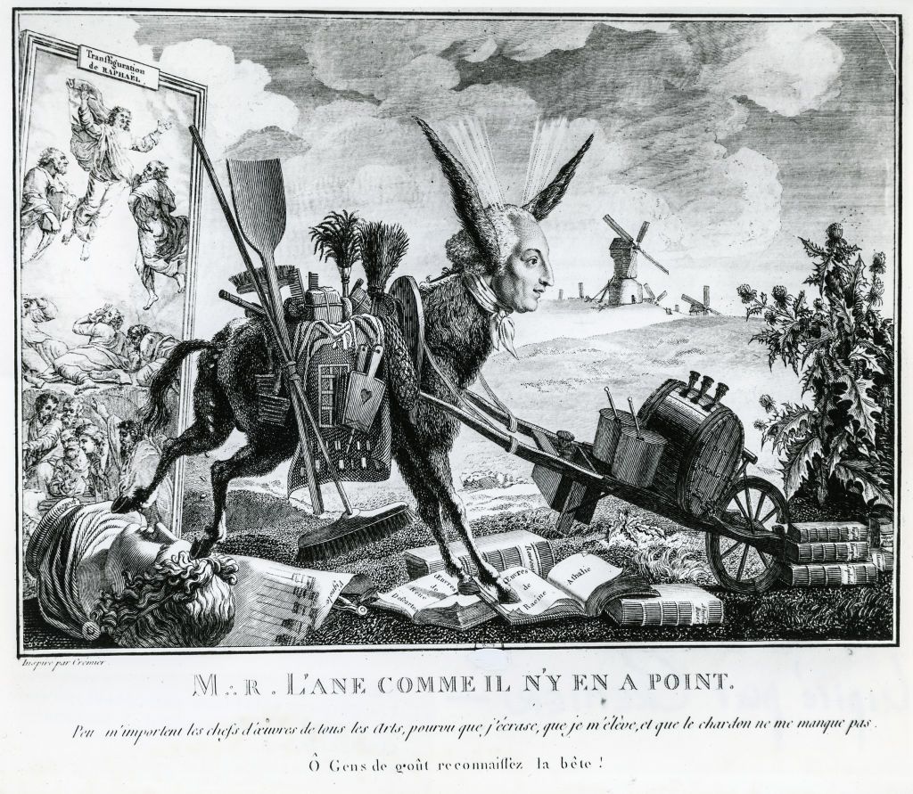 Cette caricature publiée en 1791 tourne en dérision Louis-Sébastien Mercier, écrivain prolifique et critique polémique, en le représentant en âne savant pour moquer son mépris des chefs-d’œuvre classiques, son ambition démesurée et son imposture intellectuelle.