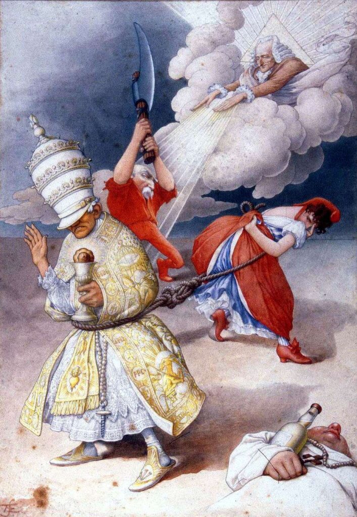 Inspiré par Voltaire, Émile Combes s’apprête à trancher le nœud gordien entre l’Église (le pape) et l’État (Marianne) tandis qu’un moine cuve son vin.