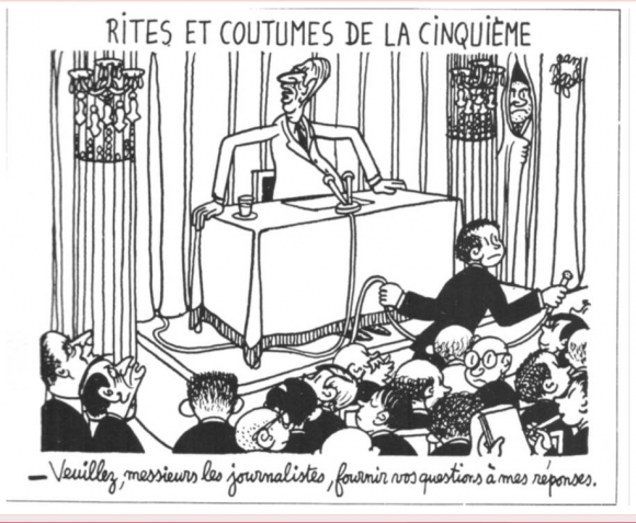 31 janvier 1964 Conférence de Presse de Charles De Gaulle, président de la République. Ce petit dessin paru la veille dans l’Express et que l’on doit à Jean Eiffel illustre parfaitement le cérémonial qui entourait ces prises de parole.