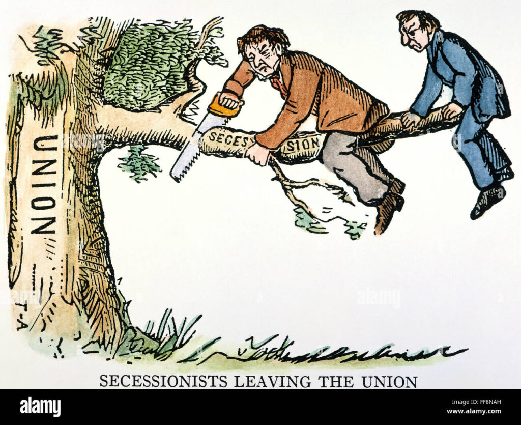 Caricature de 1861, juste avant la Guerre de Sécession (12 avril 1861 au 9 avril 1865) qui a opposé les états du Sud (Les confédérés) aux états du Nord (L’Union) des Etats-Unis. Cette guerre civile a fait 800.000 morts plus que le total de touts les guerres menées par les USA.