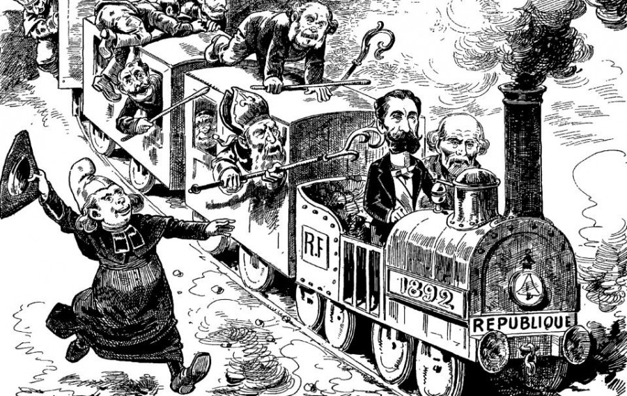 Cette caricature de Caran d’Ache a été publiée en 1892 à l’occasion de l’affaire dite du « Toast d’Alger« , un épisode très célèbre de l’histoire de la laïcité en France.
