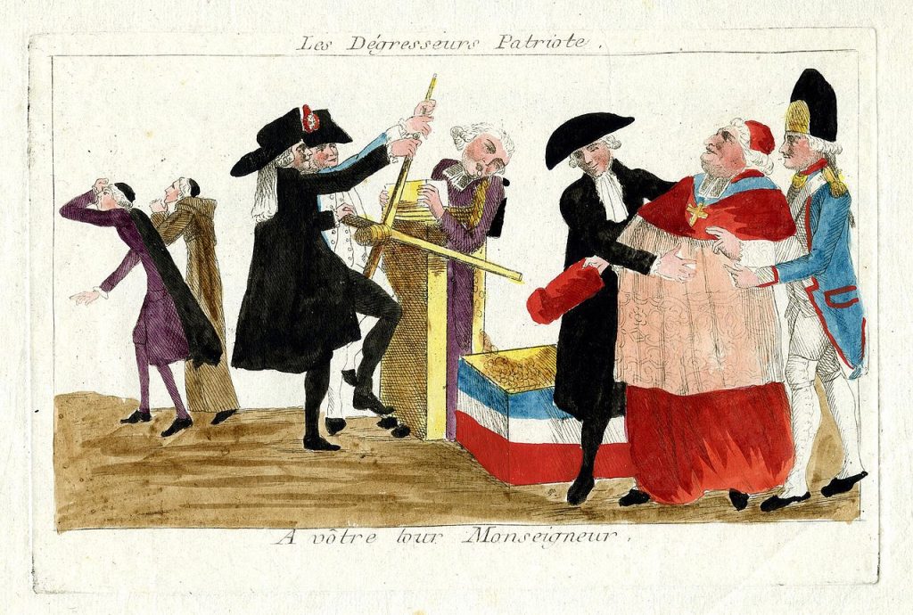 Caricature de 1789 : Les Dégraisseurs Patriote. A votre tour Monseigneur.