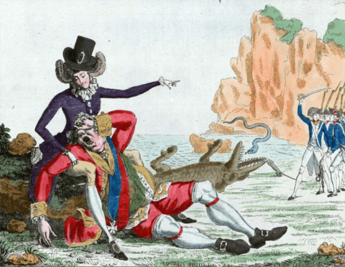Un graphique 1790 illustrant le désespoir de deux émigrés français