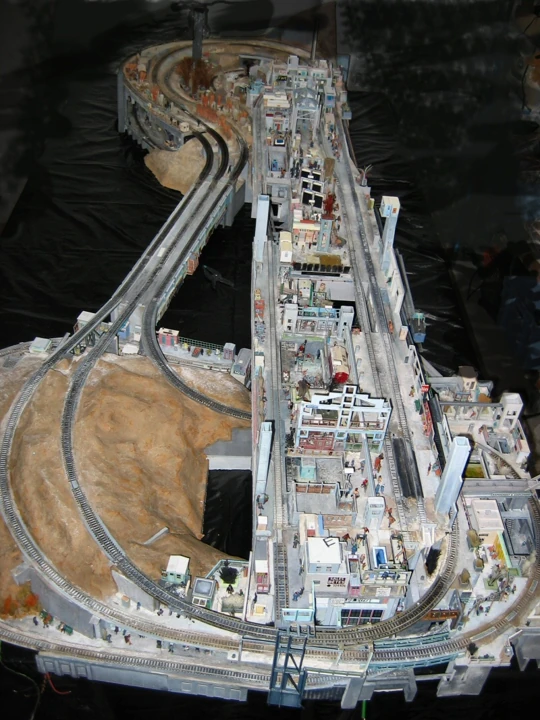 Un train dans un pc, avec des petites maisons, une gare et qui roule réellement. Les tuyaux en chromé se mêlant au rail, rien de tel pour un décor de train de marchan-