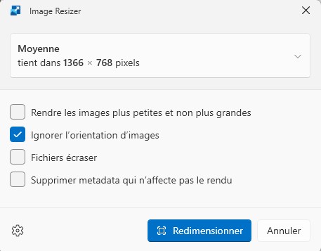 4. Pour réduire uniquement les dimensions des images une solution toute simple incluse dans Windows 10 & 11 si on a activé les PowerToys, setrouve directement dans le menu qui s’ouvre en cliquant Gauche sur une image ou un ensemble d’images on trouve » retoucher avec image resizer » qui ouvre une fenêtre